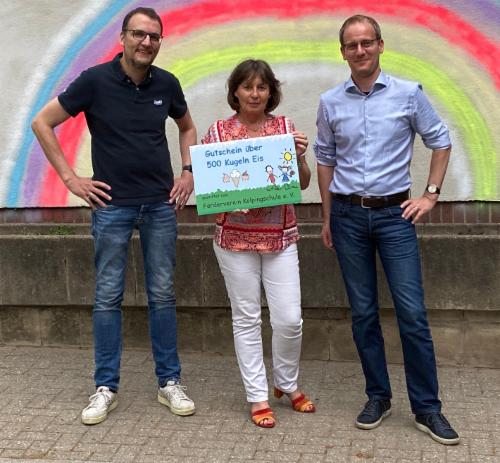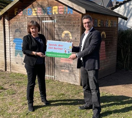 Die Übergabe erfolgte durch Andreas Dohmgans beim Schulfest mit einer Auswahl an "I-Dötzchen" an den Vorsitzenden des Fördervereins Philipp Schuchal (rechts im Bild)